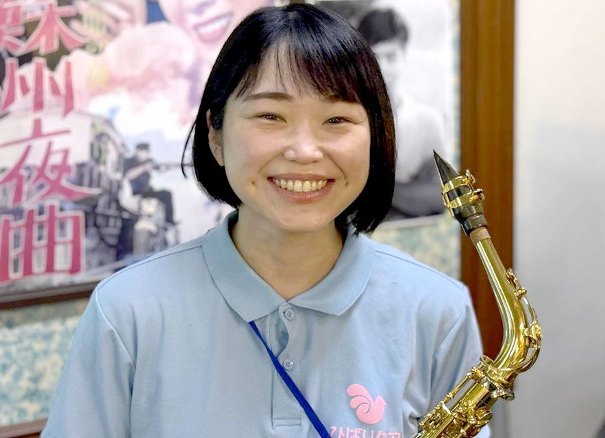 前職は飲食業界で働いていましたが、2018年にひばりケアに正社員の介護職員として入社しました。入社当初は、無資格・未経験だったこともあり入浴介助や排泄介助に抵抗感が出てくるのではと不安だったのですが、いざその場面になってみると抵抗感なく介助することができたので自分でも驚きました。ただ、入社するまで高齢者や認知症の方々と接する機会がなかったので、コミュニケーションの取り方には戸惑った記憶があります。でも、得意の楽器演奏や前職での接遇経験を業務に活かして徐々に慣れていきました。